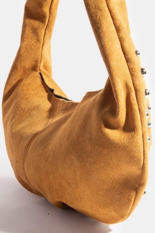 Soft Suede hobo bag in warm camel tones, detailed wih silver studs.