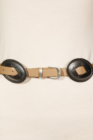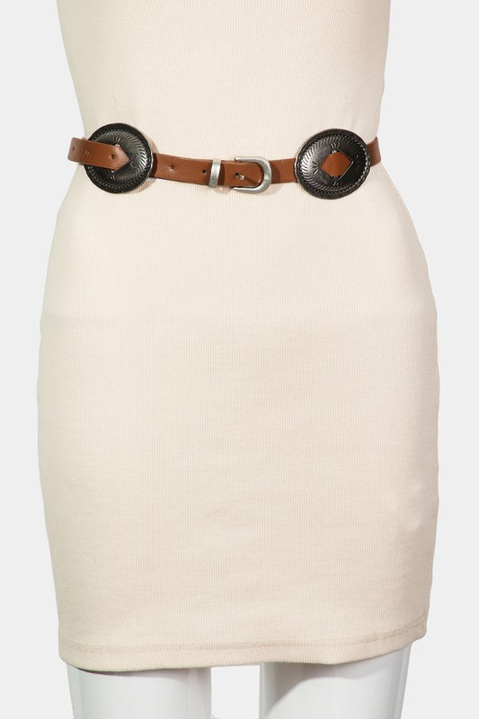 This belt adds a modern faux leather oval disc fashion style. Experience the joy of accessorizing with this piece that effortlessly combines versatility and charm.