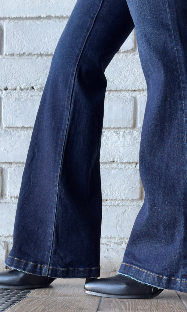 TUMMY CONTROL HIGH RISE FLARE JEANS - Rise 10" | Inseam 33" in size 3/26 - Model Info: Height 5'8" | Waist 24" | Hips 34" - Model is wearing size 1
