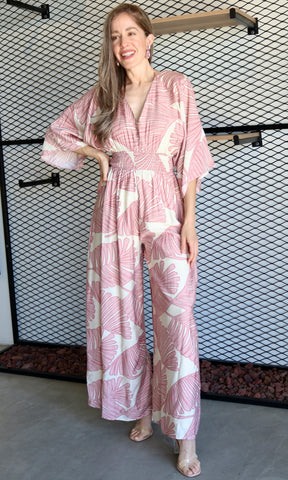 Palm Print 3/4 Sleeve V- Neck Jumpsuit
