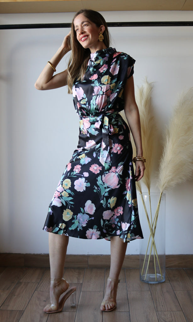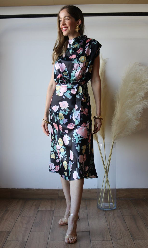 Cowl Neck Waist Tie Midi Dress