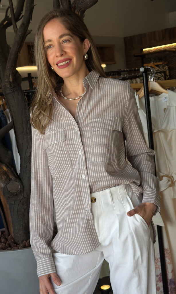 - Two Front Pockets, Roll-Tab Sleeves, Spread Collar & vertical Stripes.
