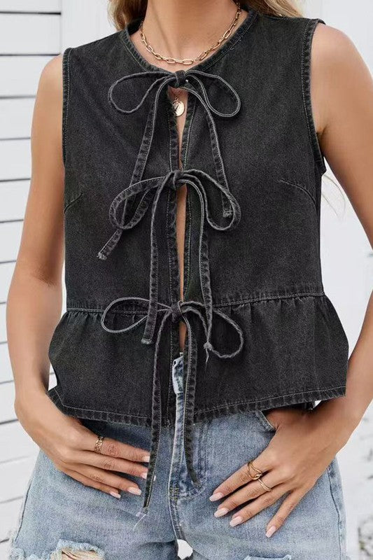 Denim Bow-tie Top With Peplum Hem